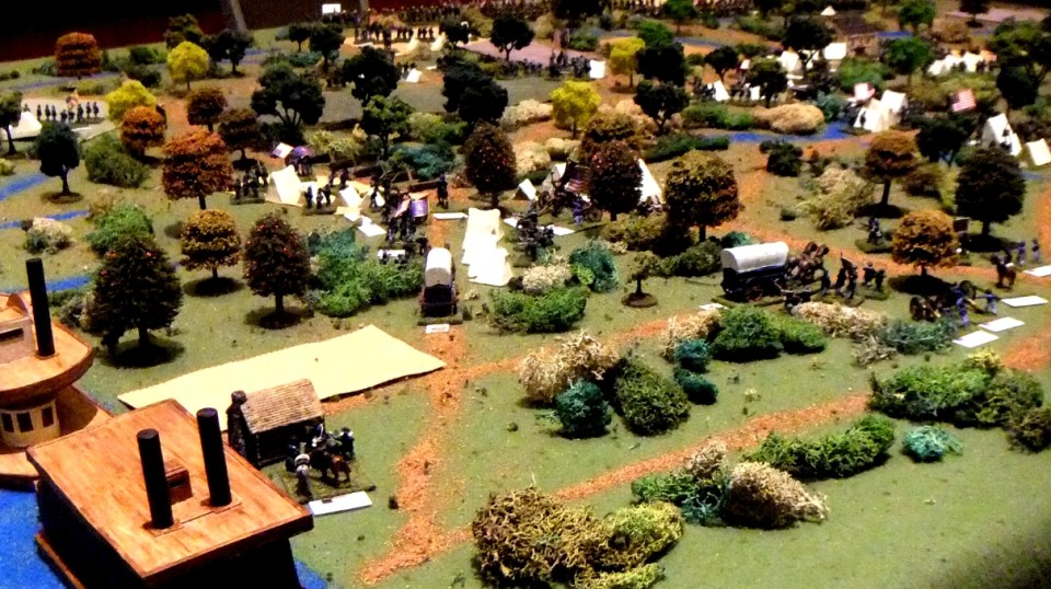 The battlefield view from Pittsburg Landing, Union steamers set to head back downriver, Union camps and Division Wagons seen in the distance.